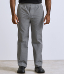 65% polyester/35% cotton with woven checks. Easy care fabric.Unisex styling.Elasticated waistband.Zip fly.Rear patch pocket.Industrial laundry 85°C.Domestic wash 60°C.